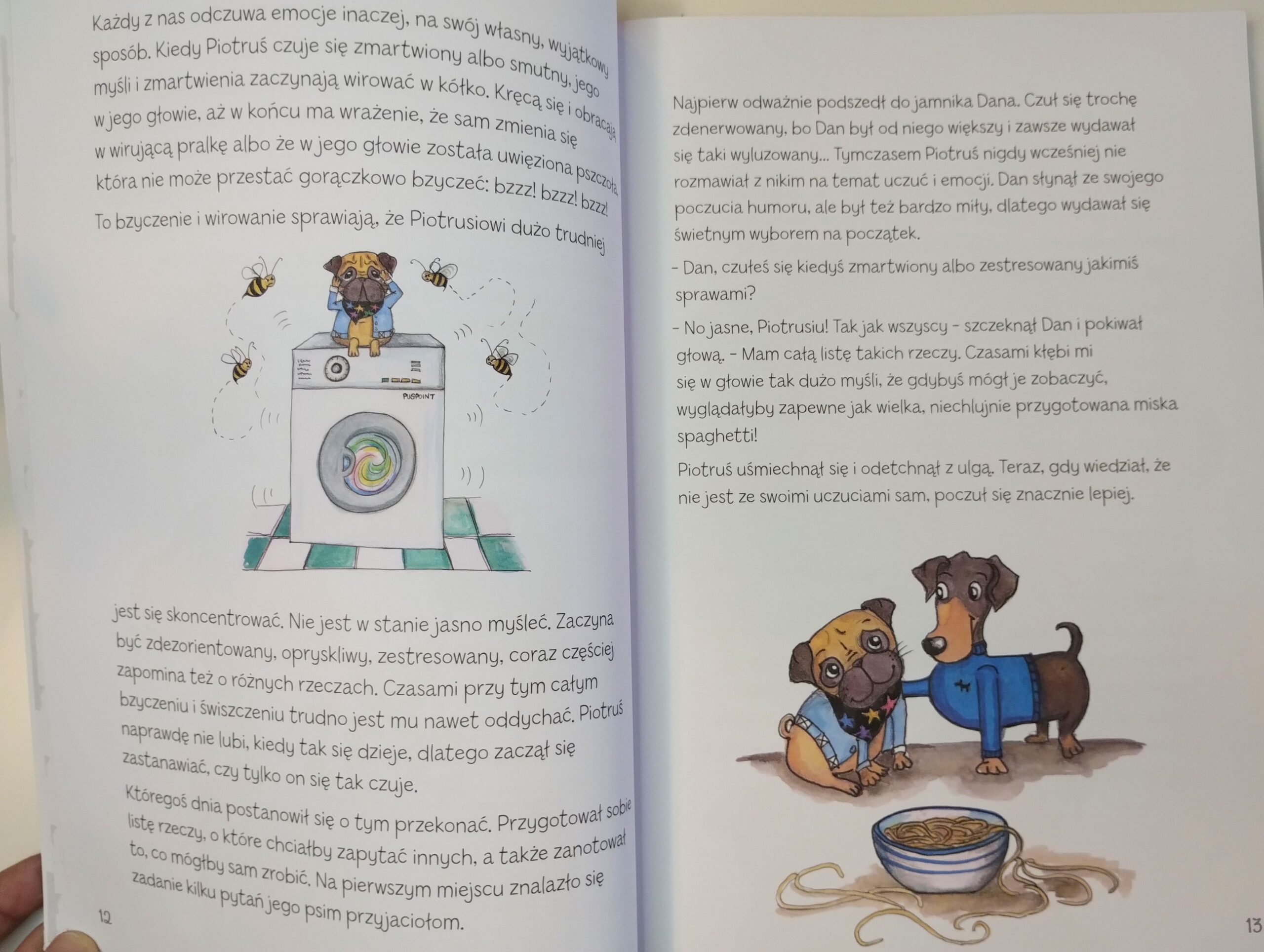 - Na początku zapoznajemy się z bardzo mądrą i wspierającą bajką o małym mopsiku, który szuka sposobu na radzenie sobie z trudnościami. Pyta więc swoich przyjaciół jakie oni mają na to sposoby, a ci chętnie dzielą się swoimi strategiami. W ten sposób dziecko razem z pieskiem zapoznaje się z różnymi technikami na budowanie poczucia bezpieczeństwa.