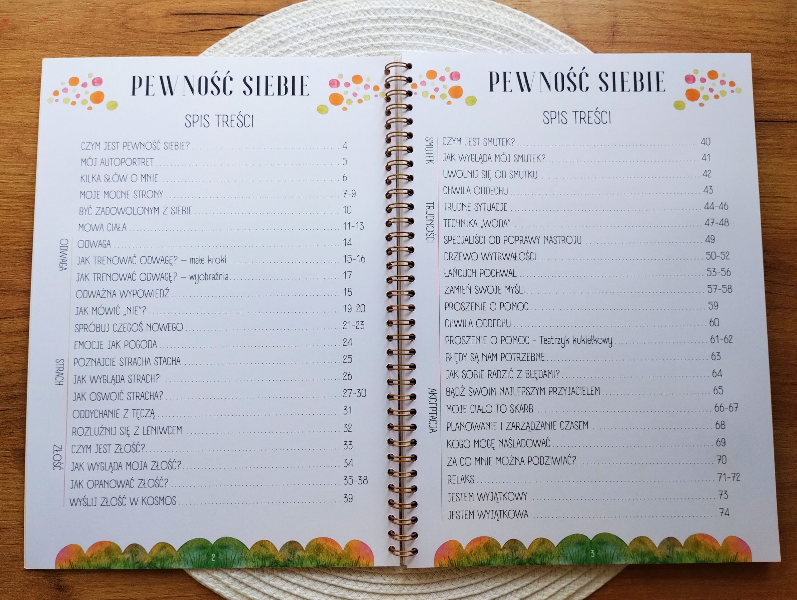 Bardzo podoba mi się, że spis treści jest przejrzysty – każdy obszar tematyczny został osobno opisany. Mamy więc zaznaczone kategorie: odwaga, strach, złość, smutek, trudności i akceptacja. Niby drobiazg, a jednak znacząca pomoc w pracy 🙂