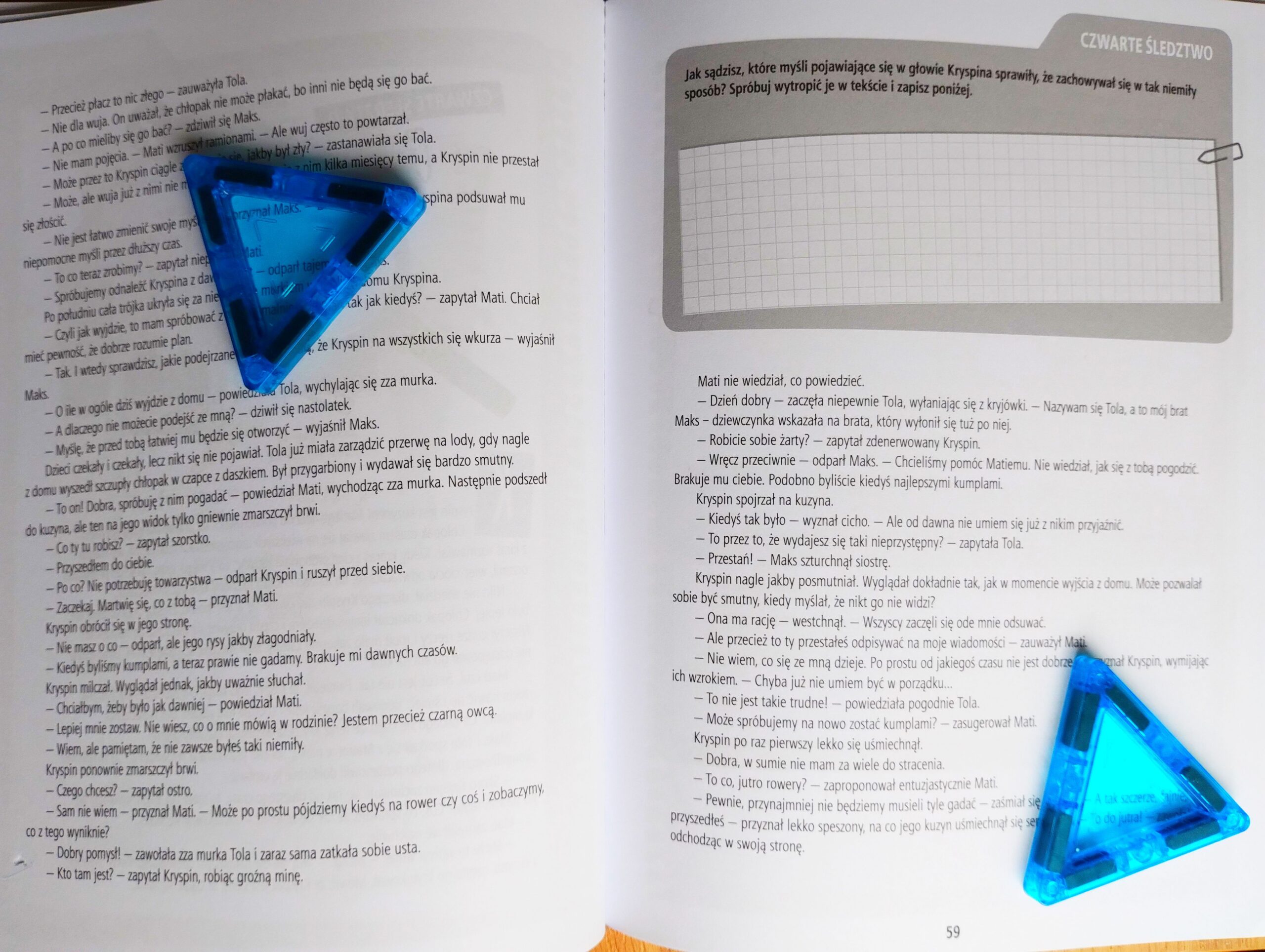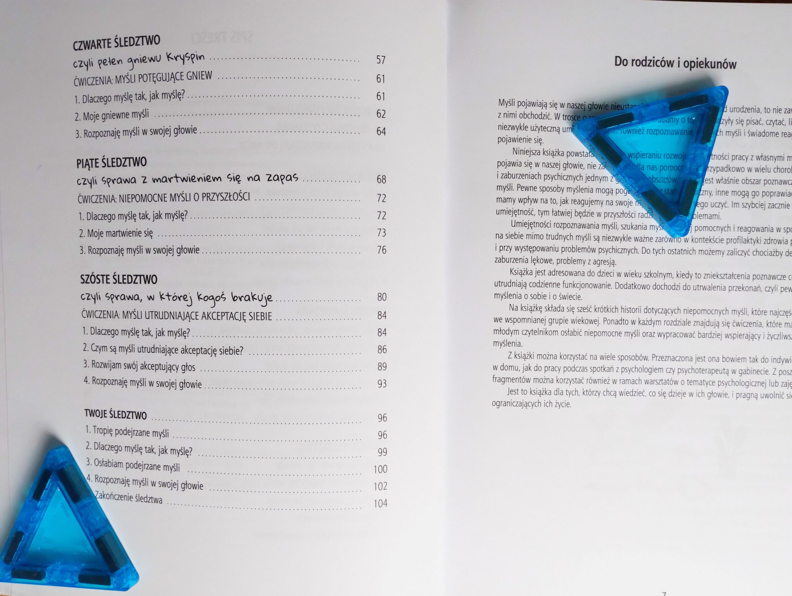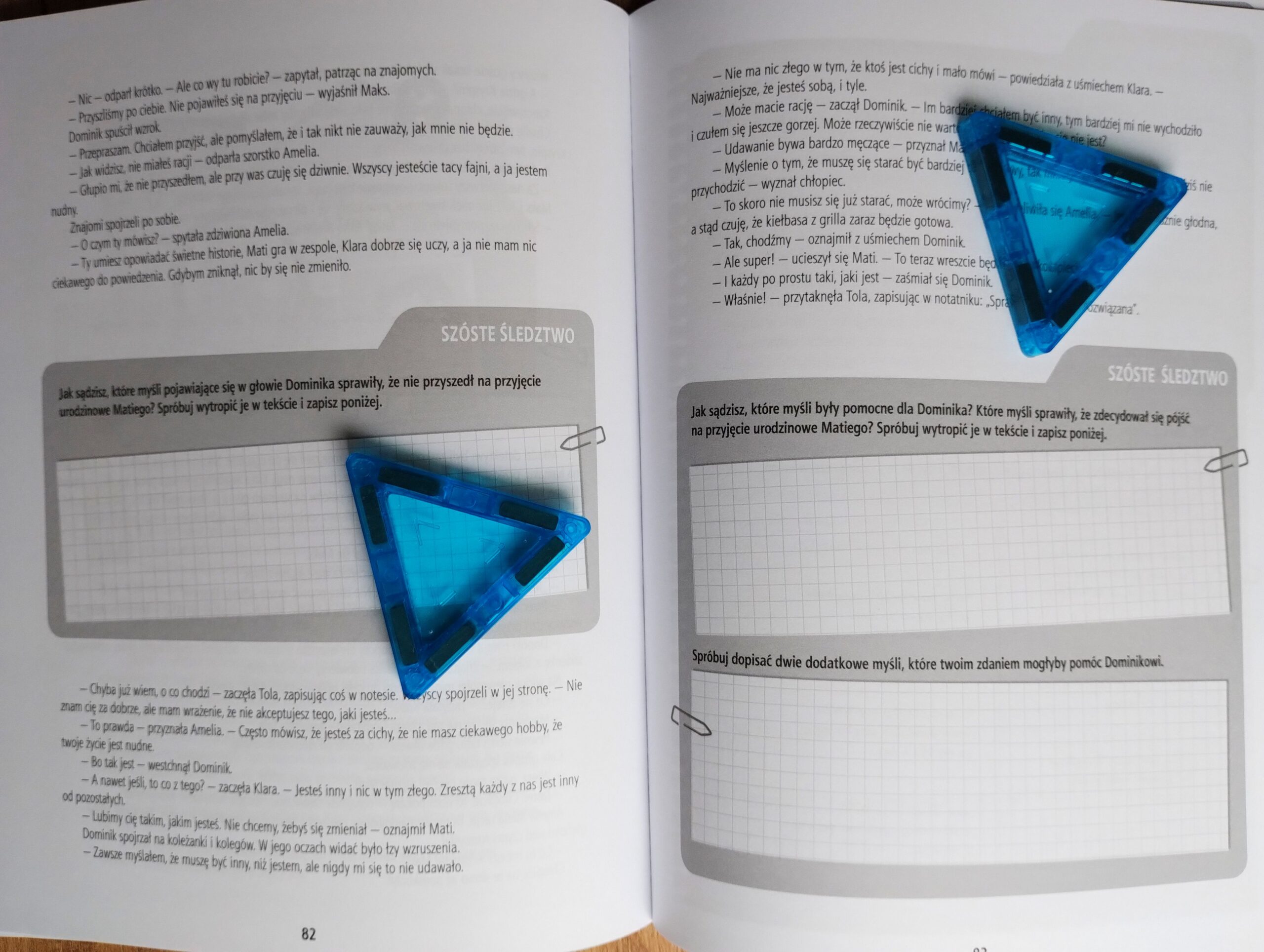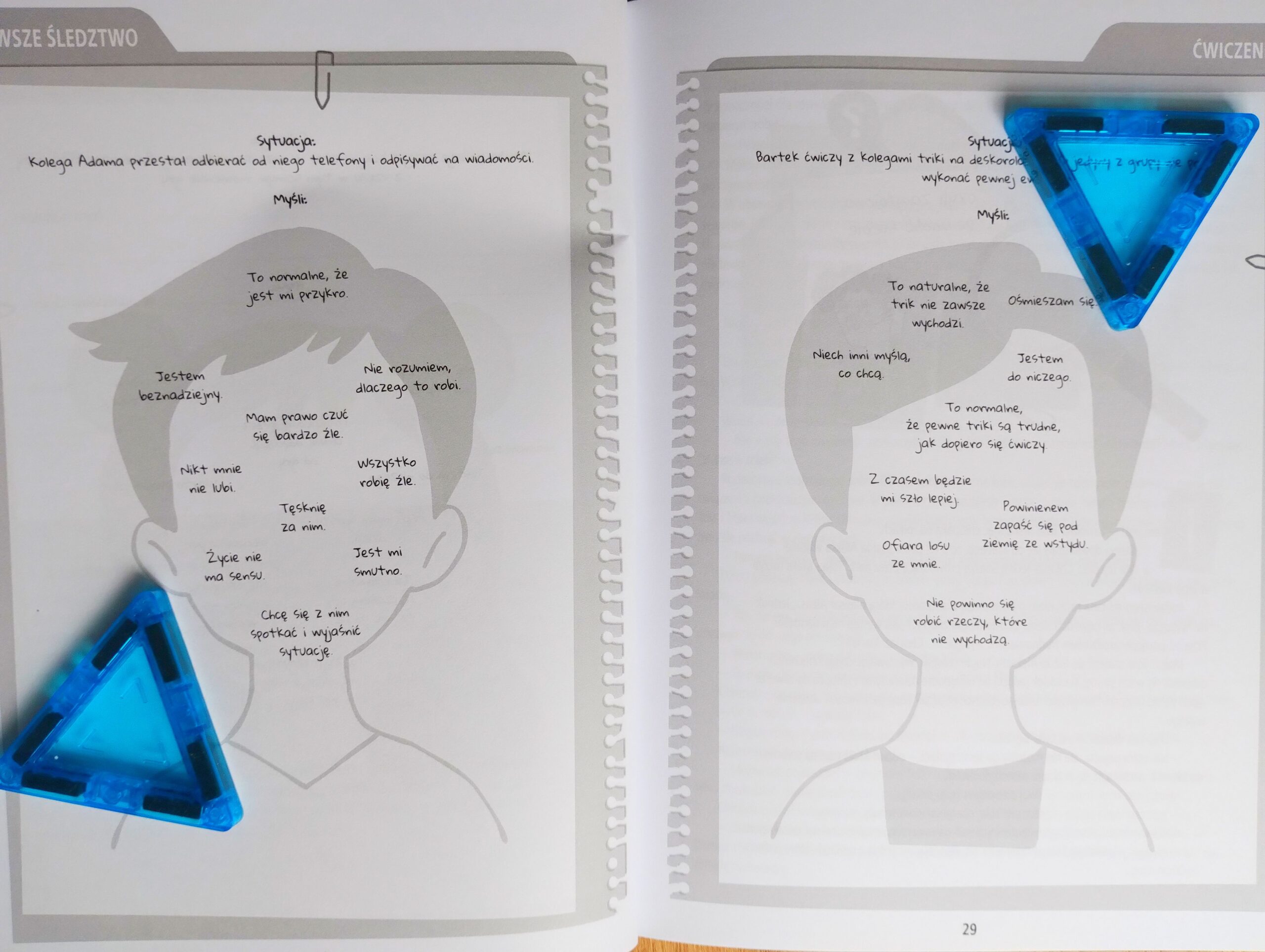 Każdy rozdział to inne śledztwo! Bardzo podoba mi się, że każdy z nich rozpoczyna się krótkim opowiadaniem, a dziecko ma za zadanie „wytropić” niepomocne myśli głównego bohatera. Zaczynamy więc bezpiecznie, od rozpracowania i omówienia „czyjegoś” problemu 🙂