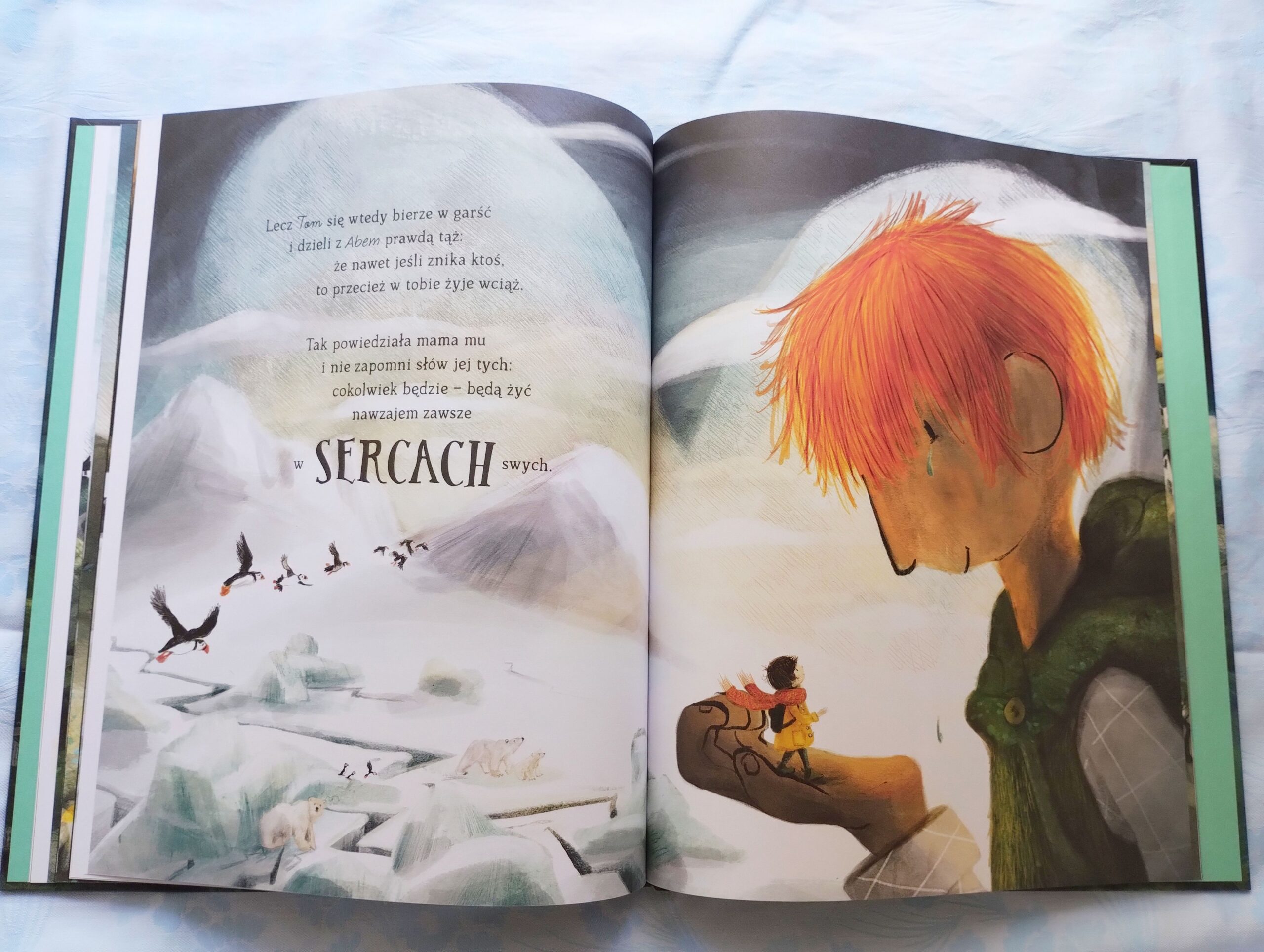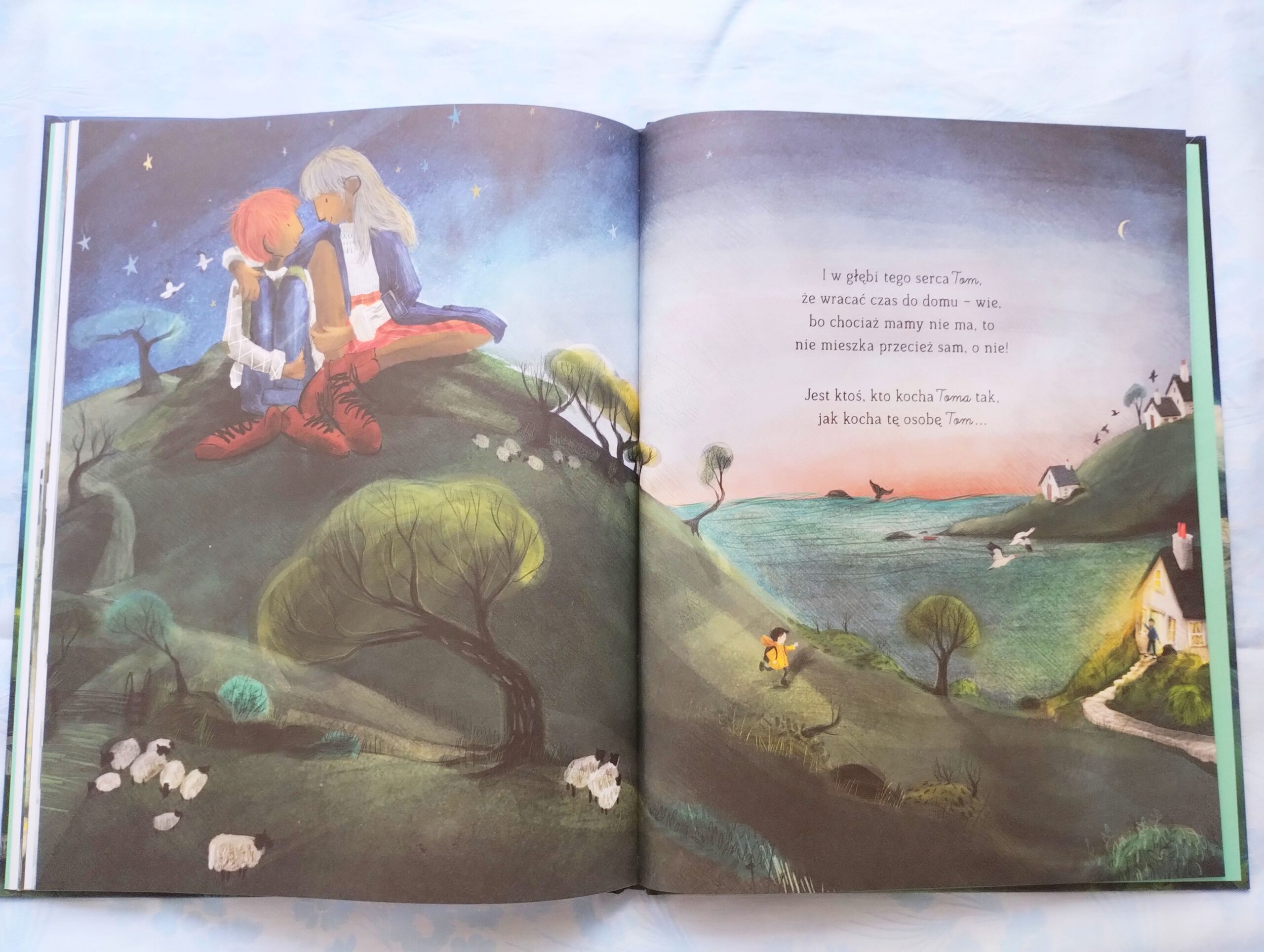 W tym zdaniu upatruję główne przesłanie tej książki. Jest piękne. Otulające. Miękkie. Dające nadzieję. Tom przypomina sobie te bardzo ważne słowa, które podarowała mu jego mama, gdy jeszcze byli razem. W moim odczuciu jest to jeden z najpiękniejszych prezentów, jakie dziecko może otrzymać od rodzica – zapewnienie, że nieważne co się wydarzy, on i tak będzie blisko.